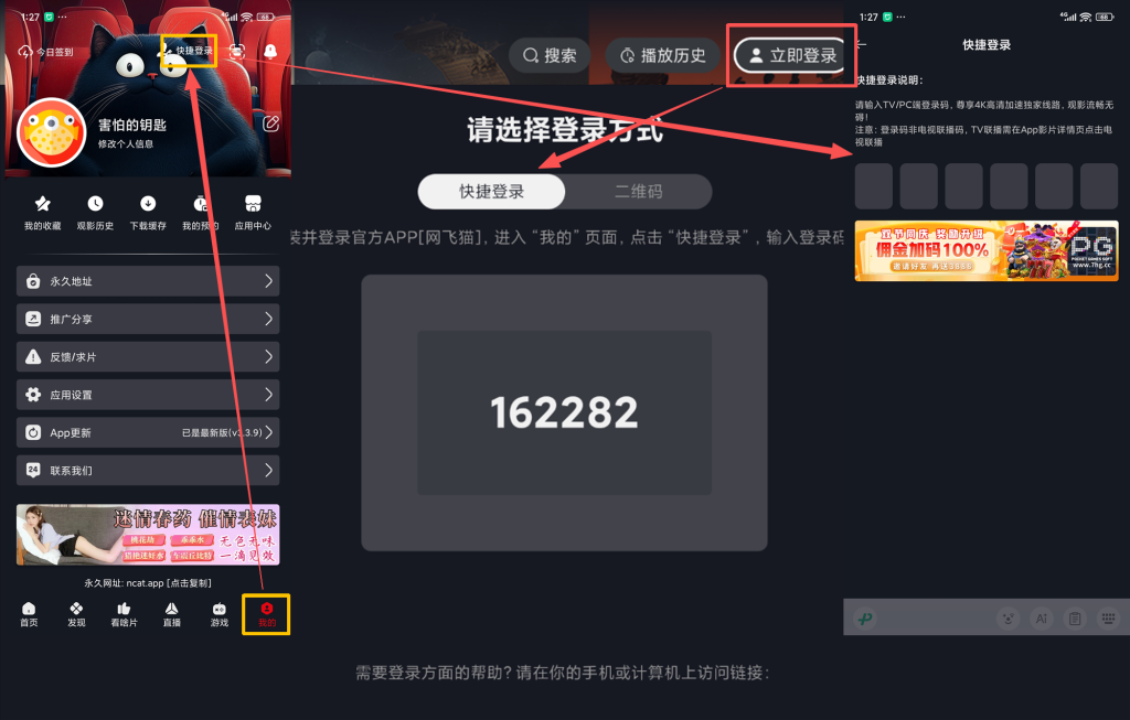 这是网飞猫的策略,需要手机版电视版同时登录,且每天手机版点击签到看一个广告。
