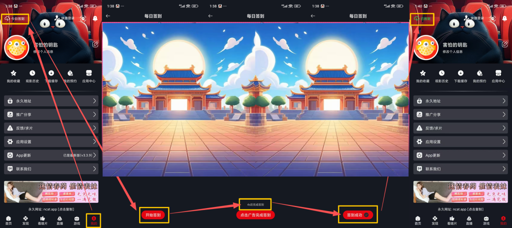 签到:在手机端上点击【我的】,点击左上角的【今日签到】,会打开一个页面,点击底部的【开始签到】,然后等待倒计时结束即可,不要点击广告,倒计时结束后会变成【签到成功】,当日就可以看高清4K了