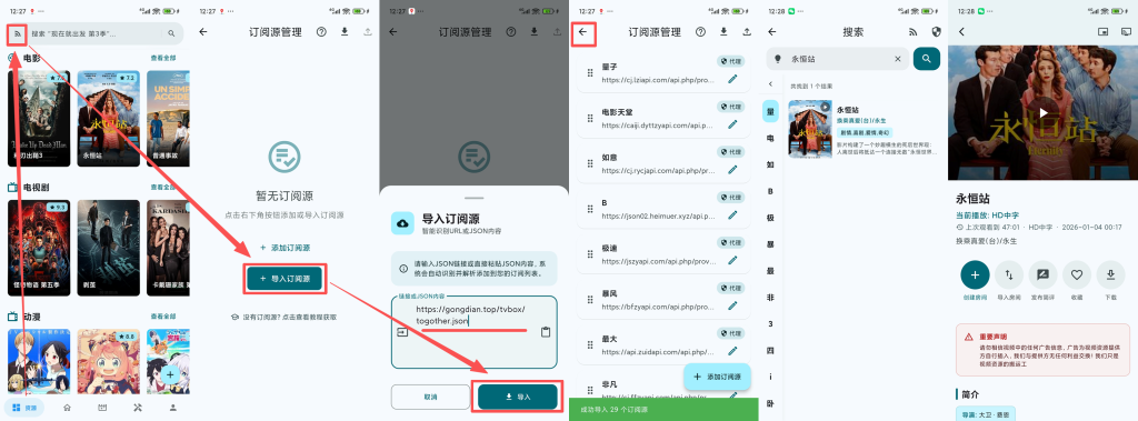 导入成功后,会提示有29个订阅源,点击左上角返回回到首页,点击一个视频相当于是在这29个订阅源里搜索,点击其中一个就可以观看了~
