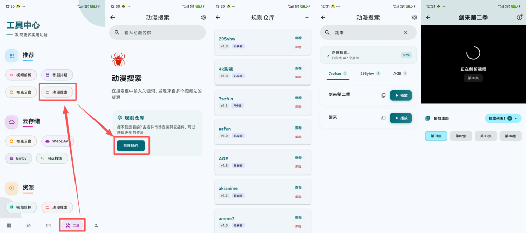 点击动漫搜索页面上的【管理插件】安装内置的插件;