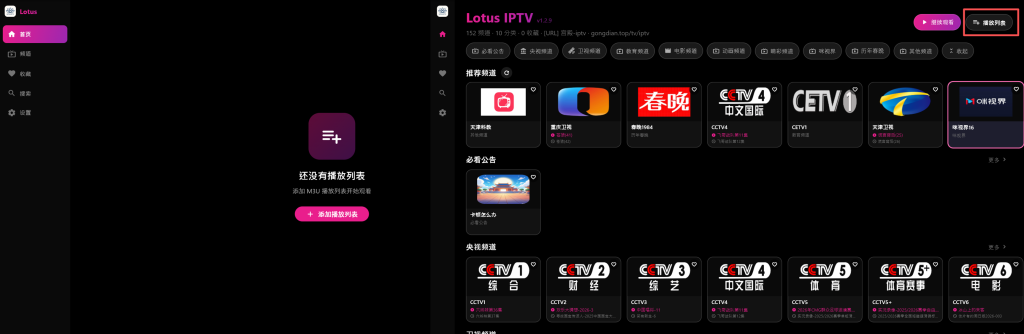 默认是没有直播源的,安装启动后需要输入直播源,如果是已经有直播源,需要再次添加或修改啥的需要首页点击右上角的【播放列表】
