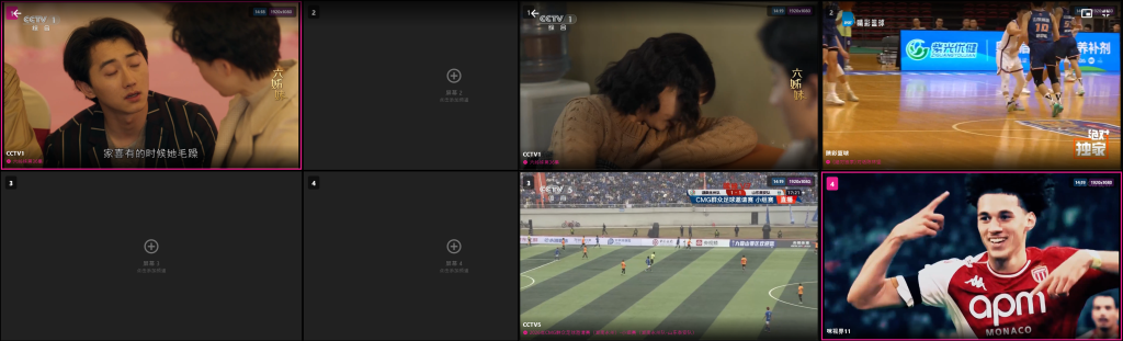 在电脑上点击一个频道后,默认是分屏播放界面,可以点击屏幕添加频道,选择某个频道,会播放某个频道的声音。
